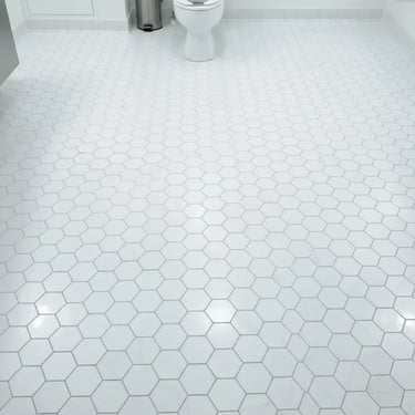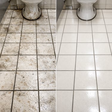 This treatment removes mineral buildup, urine scale, and dark grout discoloration around the toilet zone.