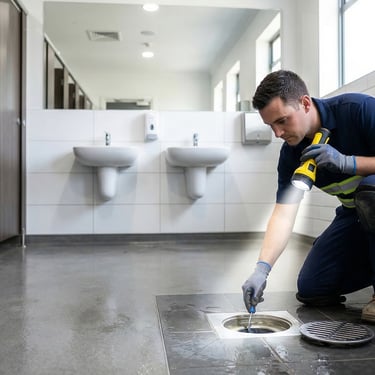 Mechanical cleaning + preventive liquid maintenance for commercial restroom drains